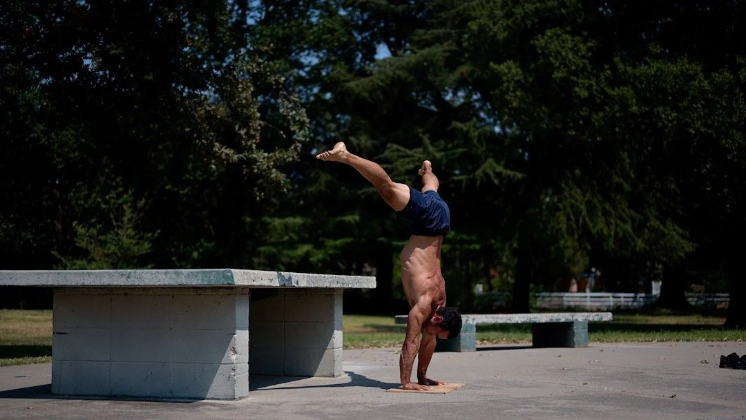 Keeping the shoulders forward (planching) and raising the legs up before bringing the shoulders back over the hands
